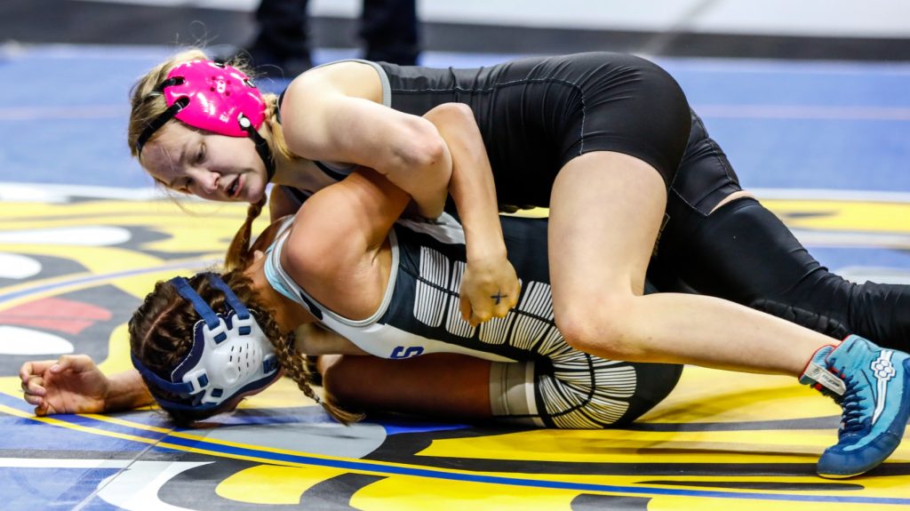 Abby Gindele, above in black, won the state championship at 124 pounds this March at the Girls State Wrestling tournament.