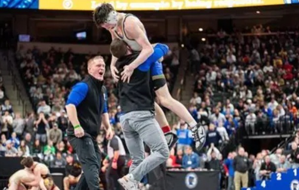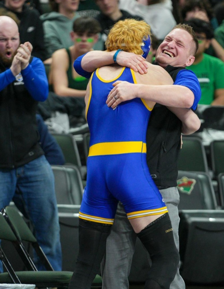 Josh Joriman, above, hugs one of his wrestlers as STMA won the team title over Shakopee, their third straight Class AAA title.