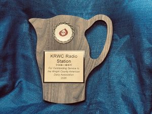 Midwest Dairy Corporate Board Chair Charles Krause, a dairy producer from rural Buffalo was the emcee for the event. Krause presented KRWC Radio a special plaque of appreciation for radio coverage of farm issues, as well as for entertaining listeners with various on-air games throughout the year that feature and highlight dairy products.
