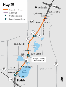 Among the major features of the project are the reconstruction of the road surface from Catlin Street in Buffalo to just south of Kjellberg Court south of Monticello, repair or replacement of infrastructure and improvements to ditch drainage, access improvements, and construction of three roundabouts to be located at Highway 25 and County Road 37, at Catlin Street in Buffalo, and at Highway 25 and County Road 113 north of Buffalo.