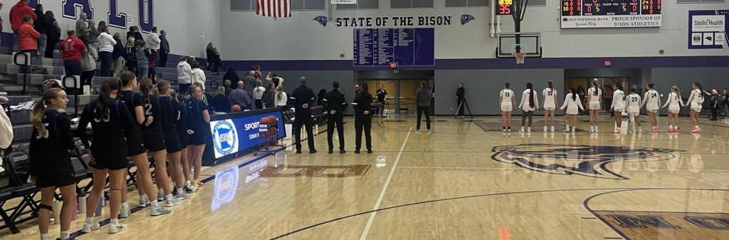Above, Buffalo and Monticello pause for the National Anthem before their game on Friday night.