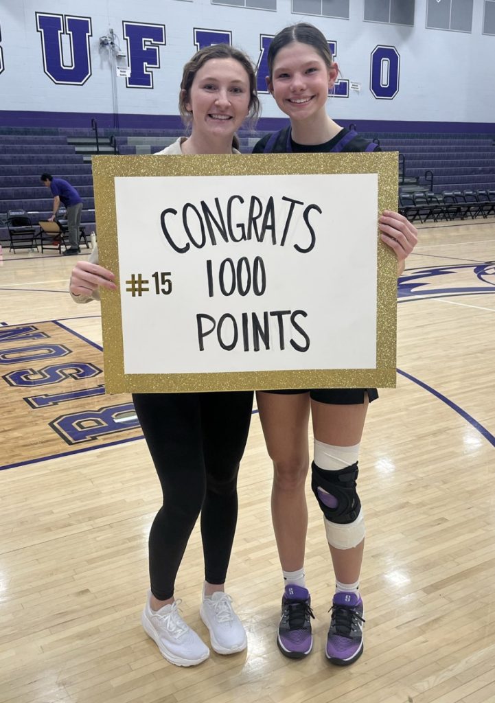 Jordan Zrust, left head coach of the Bison girls’ basketball team, and Brianna Eggers, right pose for a picture after the Bison game on Tuesday night. Eggers, a sophomore went over 1,000 points for her career against Delano.
