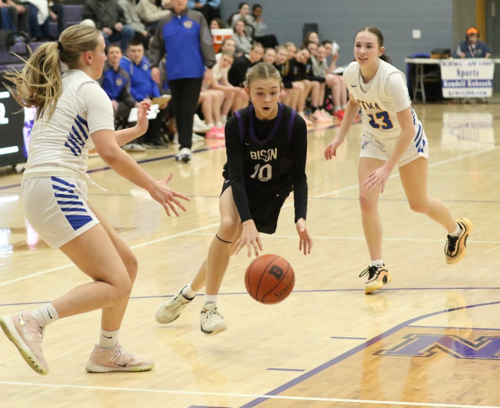 Reese Millerbernd, #10 in black, scored 19 points for the Bison in their loss to STMA on Friday night.
