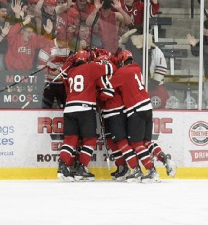 Above, Monticello celebrates an Ashton Stoll goal in the second period.