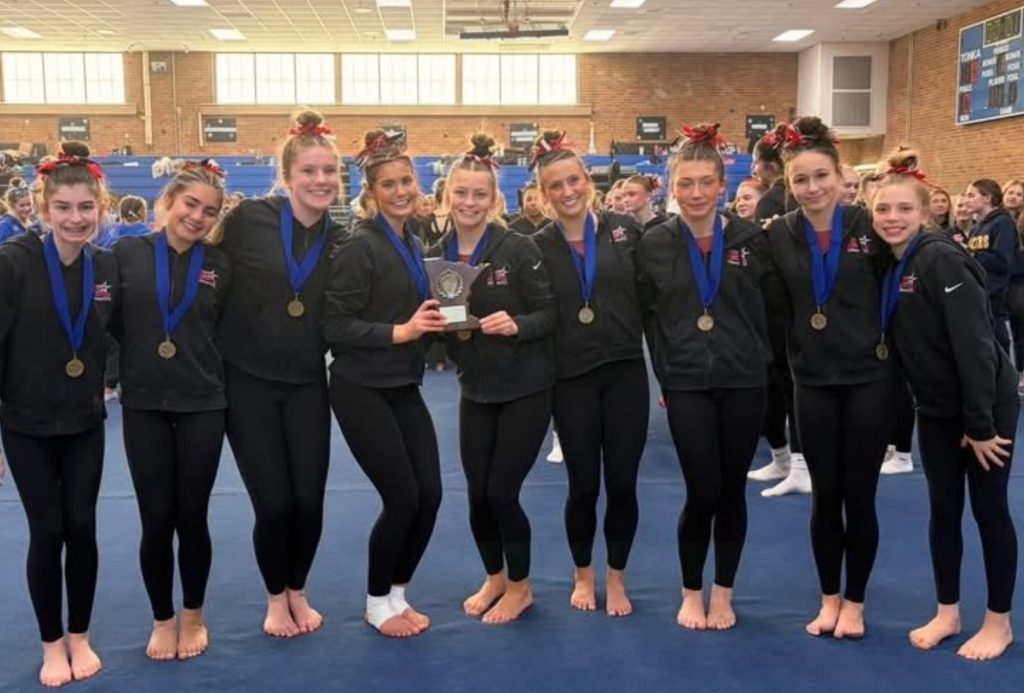 The Monticello Magic, above, accept their True Team state championship in gymnastics on Saturday.