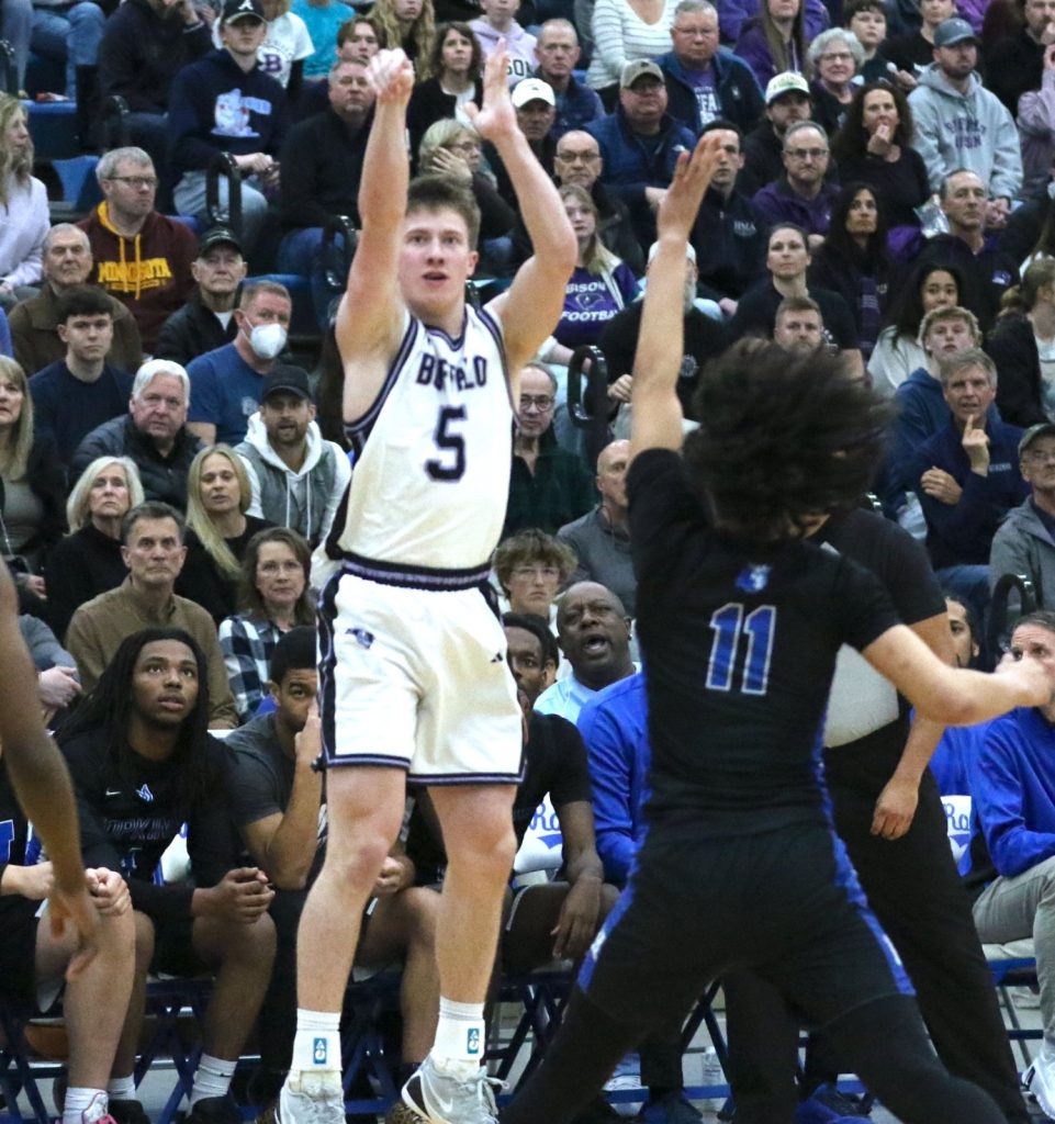 #2 Hopkins 66, #3 Buffalo 48. Jayden Moore did a little bit of everything for Hopkins, and Xavier Frelix did it booth from the mid-range and deep as the Royals defeated Buffalo in the Section 6AAAA semifinals and will move on to the championship round for a much-anticipated matchup with Wayzata on Friday night. Moore, who is headed to North Dakota, had a triple double with 11 points, 10 rebounds and 12 assists killed the Bison off the drive while Frelix scored 23 points and added 7 boards, and was lethal with his mid-range jumper and hit some key 3’s. It was even early, but a 9-0 run to end the half gave Hopkins a 29-20 halftime lead. Hopkins scored the first six of the second half and it looked like the blowout was on, but Buffalo had one big push. Led by Matthew Jordan, who finished with 17 points the Bison cut the Royals lead to 48-41 midway through the second half, but Hopkins outscored the Bison, 16-7 the rest of the way to advance to the finals.
