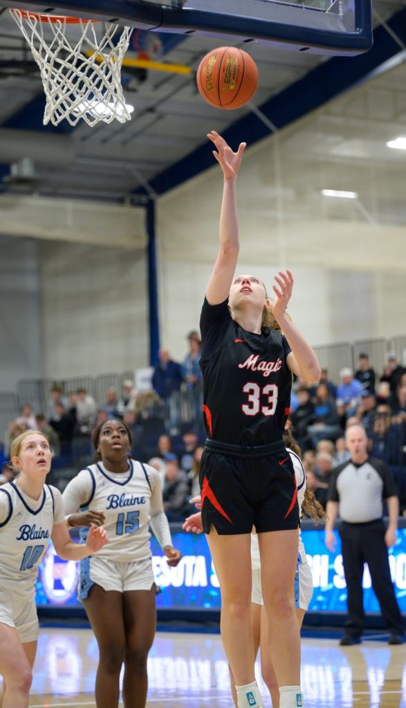 Addison Ruda, #33 in black, goes up for a layup in the consolation championship against Blaine on Friday.