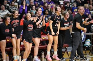 The Monticello Magic bench, above, celebrates a three pointer in the Magic’s state tournament game against Cretin Derham Hall.